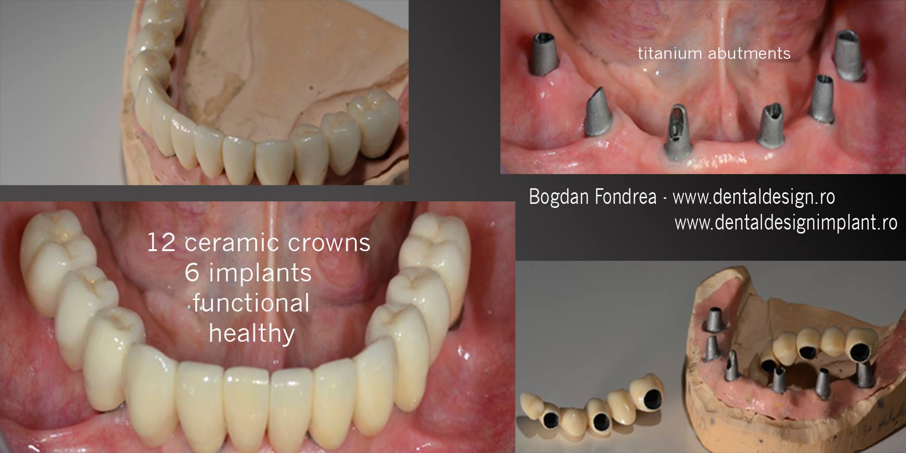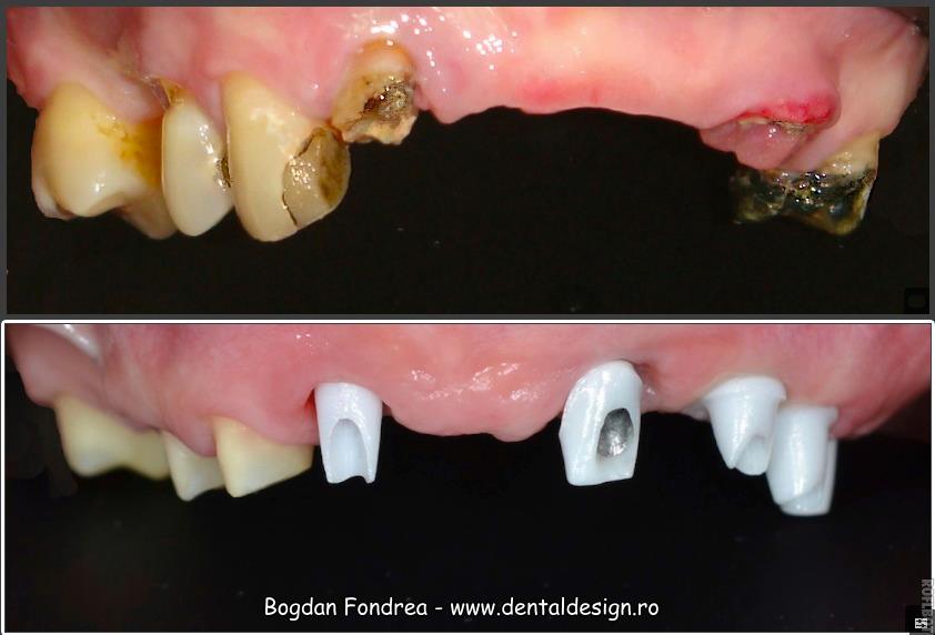 In primul colaj se observa statusul initial, sub lucrarea veche si cel final, sub lucrarea noua. Initial apar dinti infectati, infectii in os, gingivita, carii,