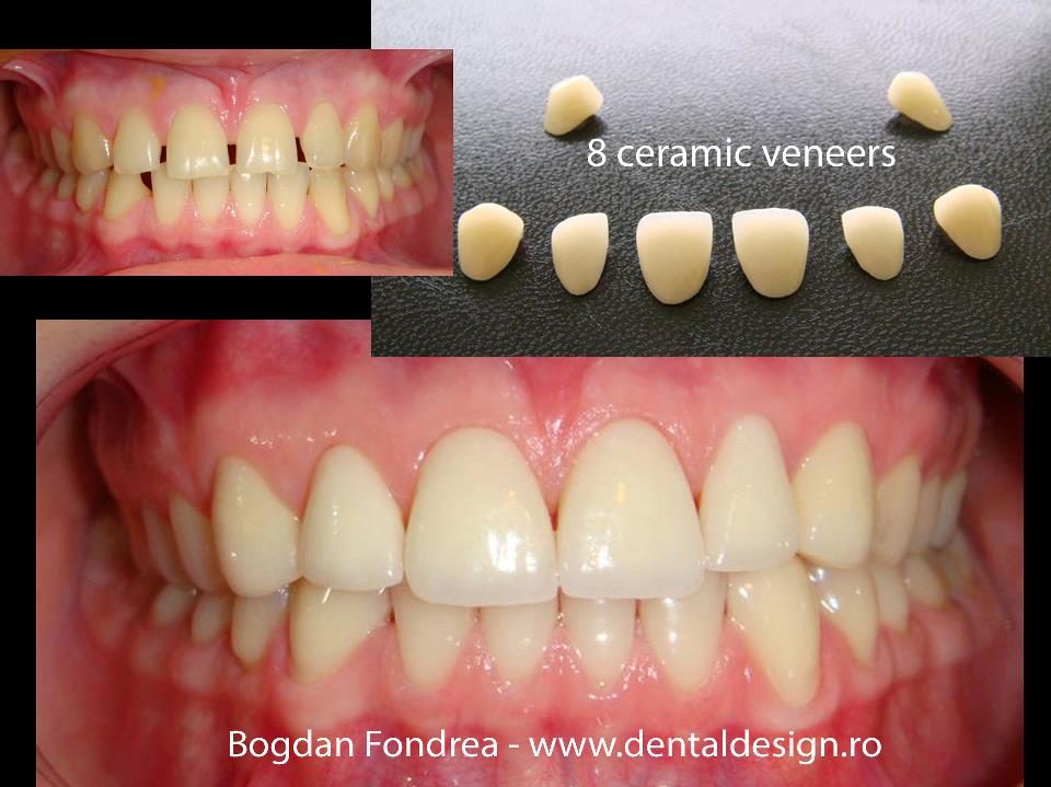 Pentru a obtine acest rezultat s-au folosit opt fatete ceramice, veneers. Spatiile dintre dinti au fost inchise, culoarea este asa cum si-a dorit pacienta, forma