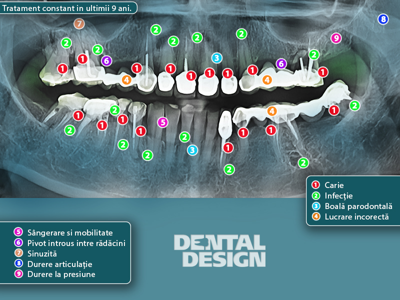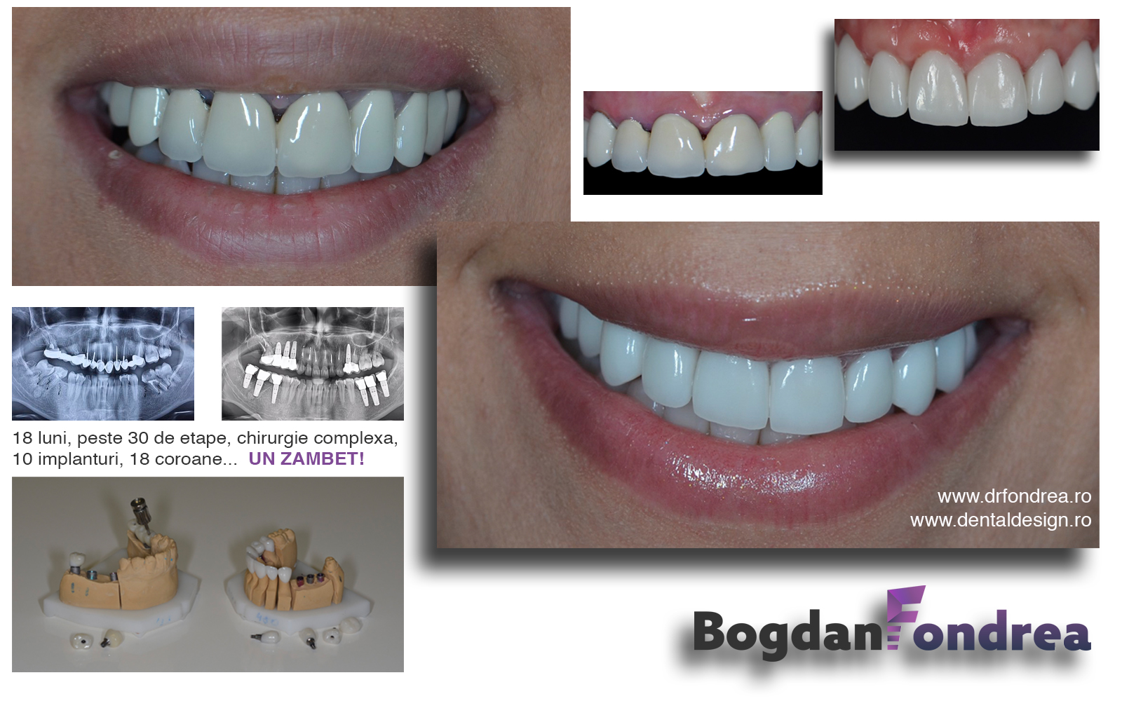 Acesta este un caz dificil si complex, cu probleme parodontale majore, infectii, tratamente incorecte, lucrari inestetice. Au fost necesare 19 extractii, 4 tratamente de canal