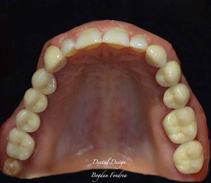 Reabilitare totala. Acesta este modul in care lucrarea vine de la tehnician si este prezentata pacientului. Detaliile dorite de pacient se regasesc in executia finala